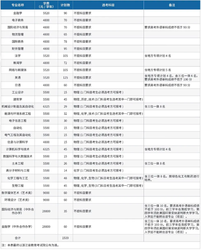 2020年,浙大宁波理工学院转设成功,迎来中国科学院院士杨德仁担任学校转制后的首任校长。学校共有27个普通专业和2个中外合作专业进行普通本科招生,今年暂停了商务英语和制药工程专业的招生,分别纳入英语、化学工程与工艺专业进行招生,同时,招生计划重点已逐渐向国家、省级重点专业倾斜,其中机械设计制造及自动化、土木工程、自动化、金融学、网络与新媒体、生物工程和计算机科学与技术等7个国家、省一流专业共安排计划招生835名,占总普招计划的近35%。