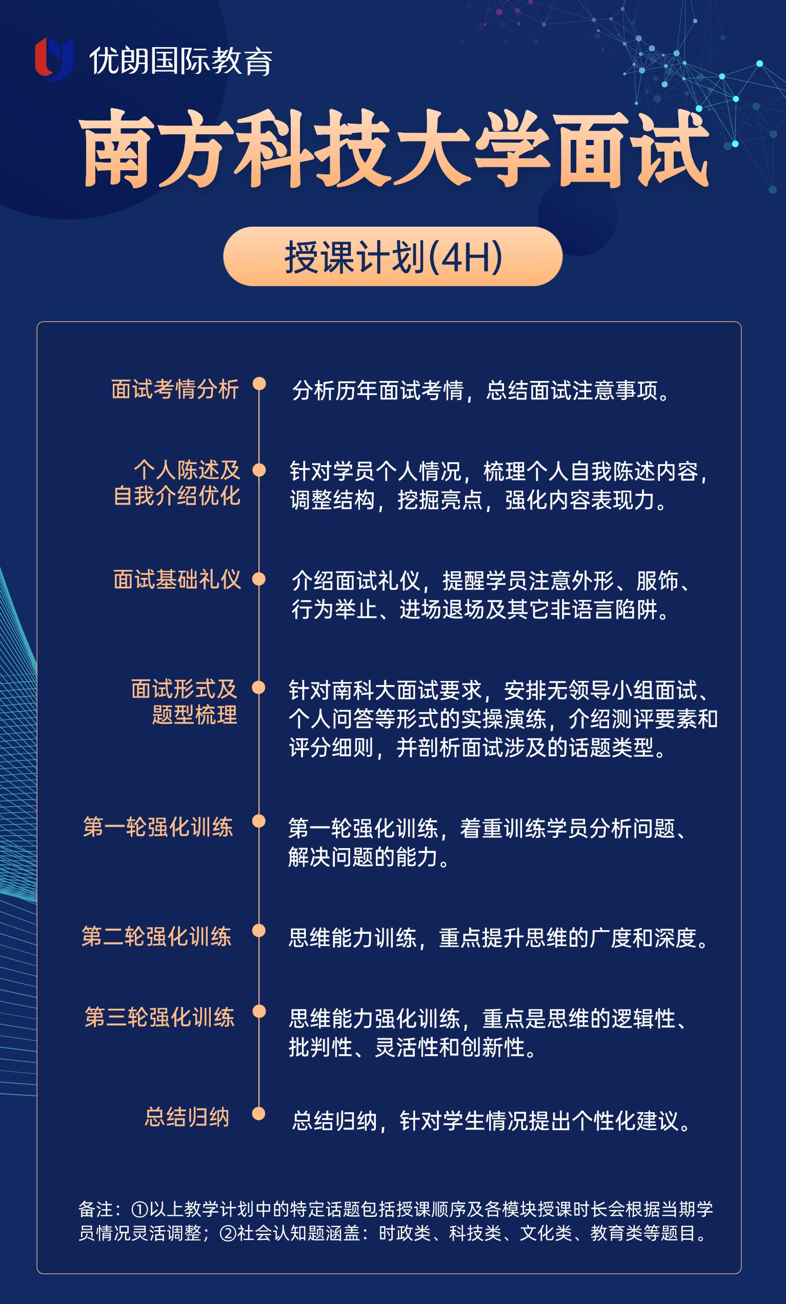 为帮助广大考生在南科大综合评价校测中取得优异成绩,优朗2025年将继续开展南科大综合评价面试培训班,具体如下:
