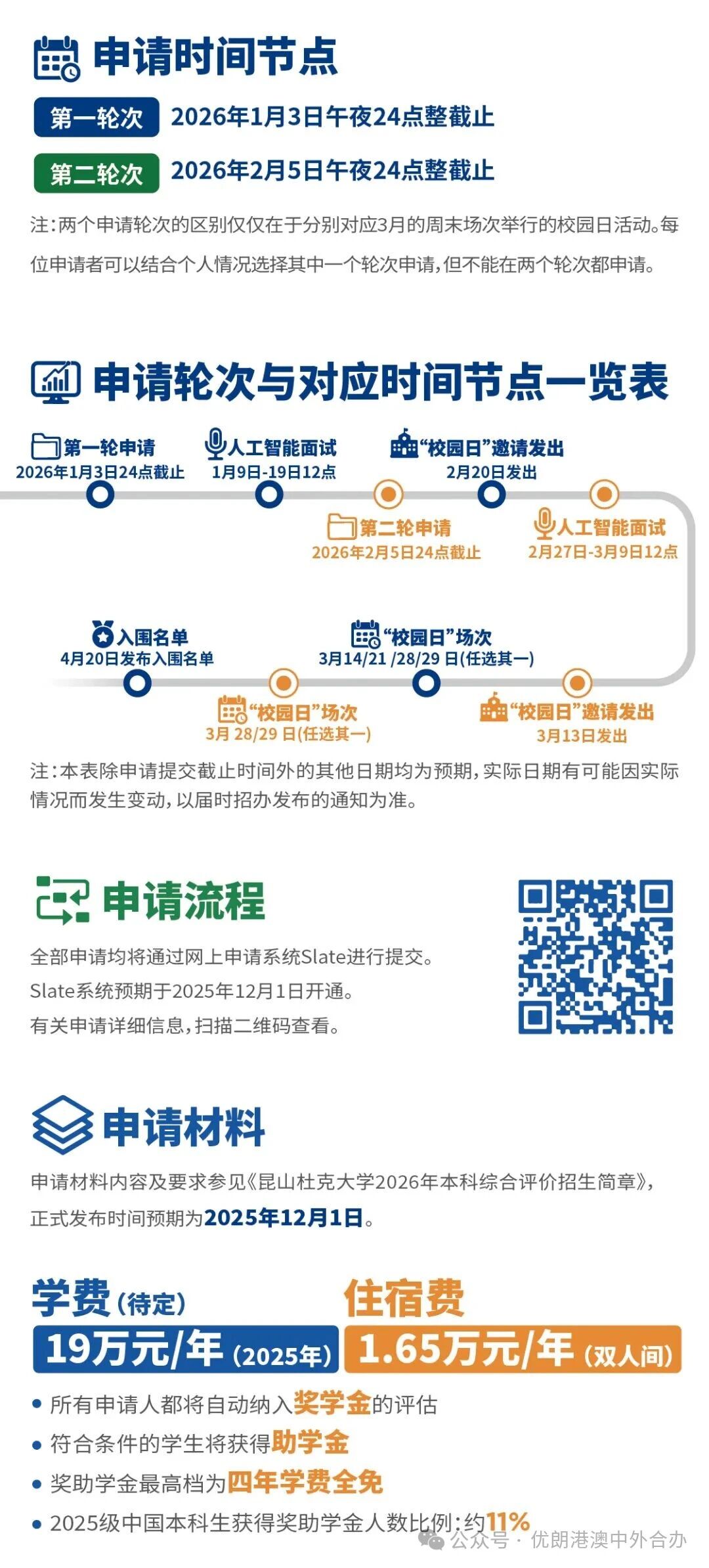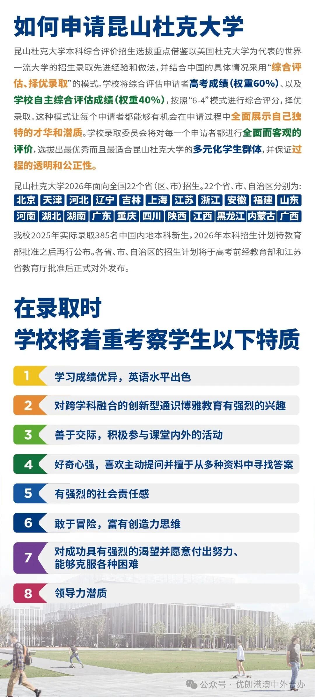 昨日,昆山杜克大学发布本科教育招生文件,文件内容包含昆杜2026年招生省市、招生专业、申请节点、申请流程、学费/奖学金等重点内容,优朗小编汇总整理了招生要点及完整文件信息,一起来看!