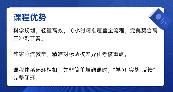 先导课:专为忙碌于高考备考的同学们量身定制,购买后随时听讲,为后续的8小时冲刺课筑牢根基。