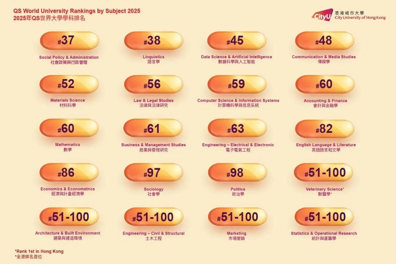 此外,港城大在2025年QS世界大学学科排名中也表现卓越,共有20个学科位列世界百强,其中4个学科跻身全球前50位,12个学科位列香港前三位,彰显港城大的学术实力在国际学术界再次获得肯定。