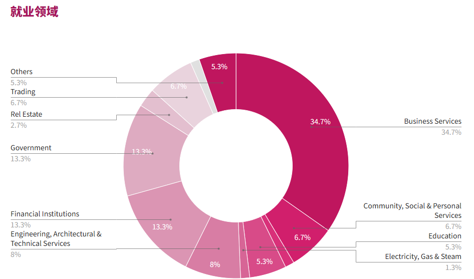 职业前景:毕业生在就业市场取得了巨大成功,他们中的许多人都能在包括政府部门、社会与市场研究、新闻、公共关系、商业、金融、项目规划与管理以及社会企业等众多职业领域找到工作。请参阅图表,了解2022届和2023届毕业生的就业领域详:
