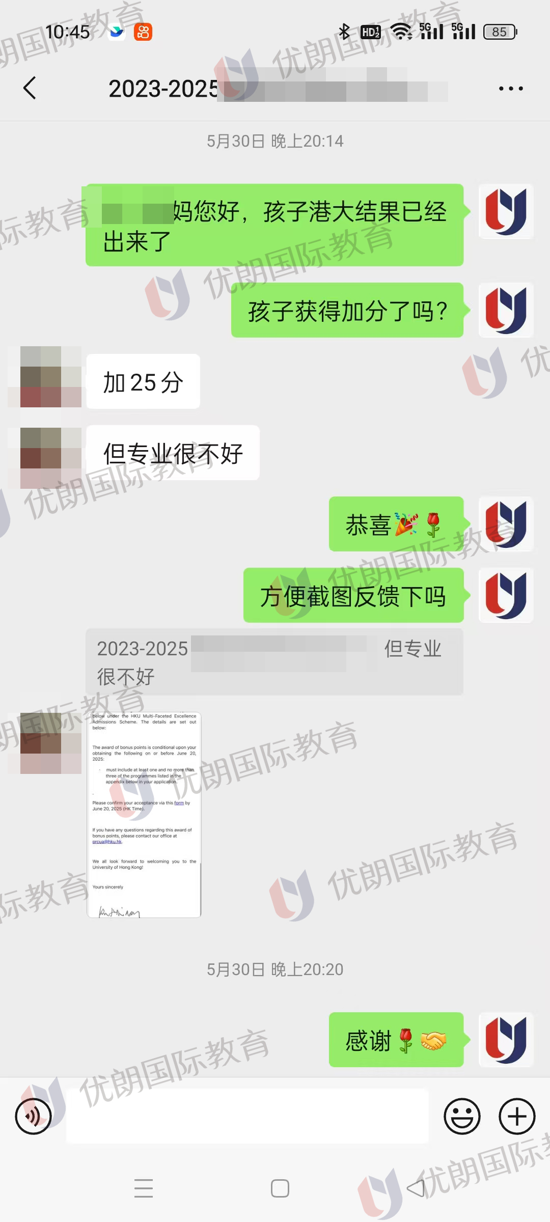 最终结果:斩获25分加分,成功锁定港大热门专业方向,家长与学员均对优朗服务高度认可。