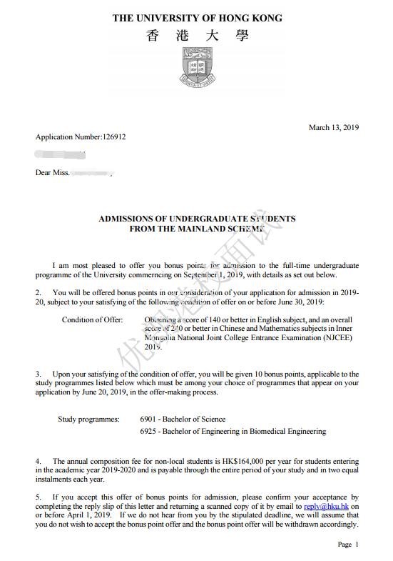 案例二:另外一位优朗学员H同学,错过了卓越计划的报名,被港大邀请参加6月份面试。高考分数692,省排名445,却没有被录取,不是因为学生不优秀,高考成绩达到690分+的学生,哪个不是“天之骄子”?实际上,香港大学会结合学生的面试表现和高考成绩在专业内进行排名,择优录取。相比Y同学,H同学虽然高考成绩更突出,但没有Y同学的卓越计划20分加分,也就失去了高考成绩的优势。