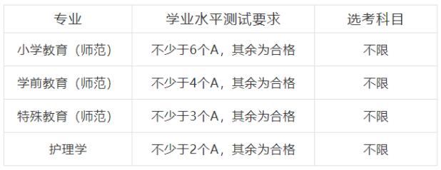小学教育(师范)、学前教育(师范)、特殊教育(师范)、护理学专业综合成绩按“学业水平测试成绩(折算成满分100分)×10%+综合素质测试成绩(折算成满分100分)×30%+高考文化成绩(折算成满分100分)×60%”计算形成,其中学业水平测试A等计10分,B等计5分,C等计2分,D等不计分。