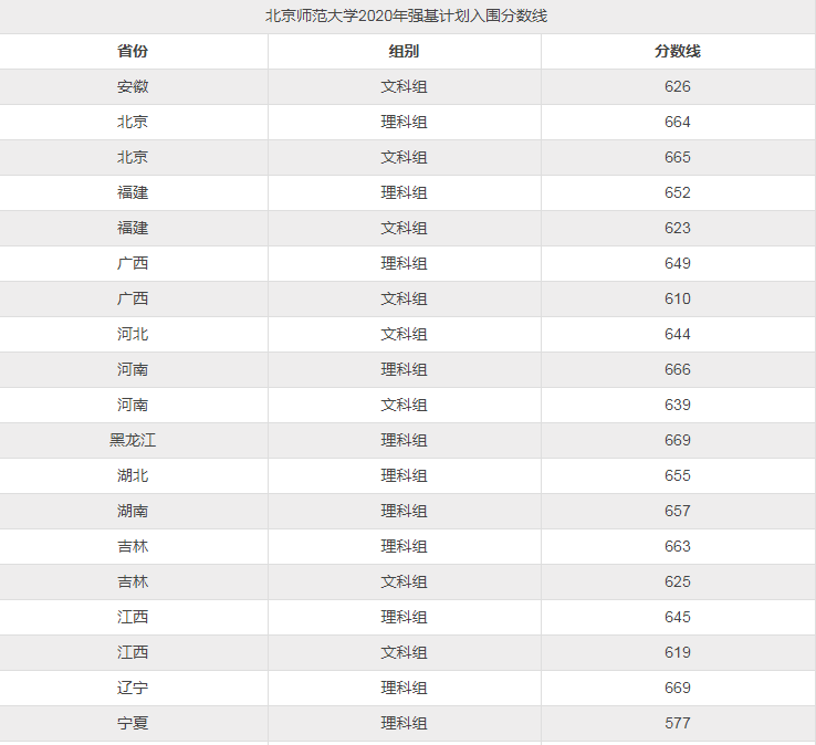 北师大强基计划入围分数线在7月26日左右公布,考生须登录报名系统查询并确认结果。经查询,北京师范大学2020年强基计划入围分数线如下:安徽省文科626分;北京市理科664分、文科665分;福建省理科652分、文科623分;广西省理科649分、文科610分;河北省文科644分;河南省理科666分、文科639分;黑龙江省理科669分;湖北省理科655分;湖南省理科657分;吉林省理科663分、文科625分;其余江西、辽宁、宁夏、山东、陕西、山西、四川、天津、新疆、云南、浙江、重庆各省强基计划入围分数线如下图所示。