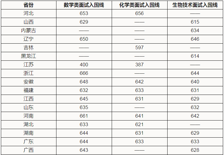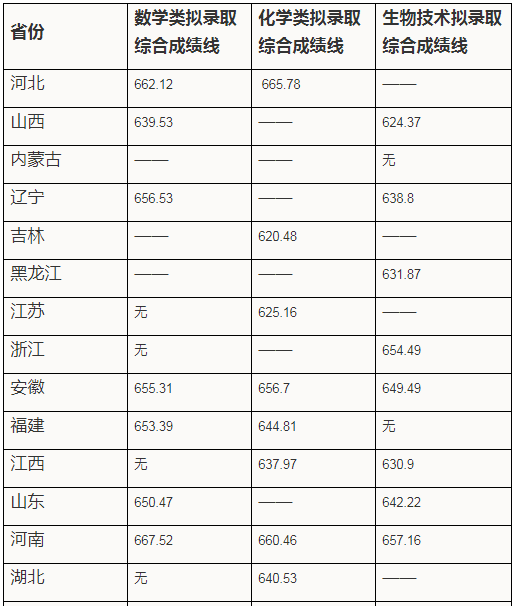 2020年华南理工大学强基计划录取分数线如下图所示,同样是分省分专业列举,经过与入围分数线对比,整体而言,由于增加了校测面试成绩,录取分数显然要高于入围分,例如河北省数学类录取分数线为662,而入围分数线为653;但是也有一个现象值得注意,很多专业都显示“无”,说明该专业考生未招满,缺少数据,造成这一情况的原因可能由于该生面试表现不佳,落选;也可能由于该生弃考华工强基计划面试,通过正常填报志愿前往其他院校。’