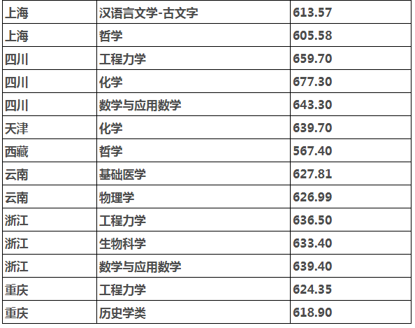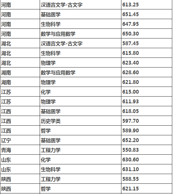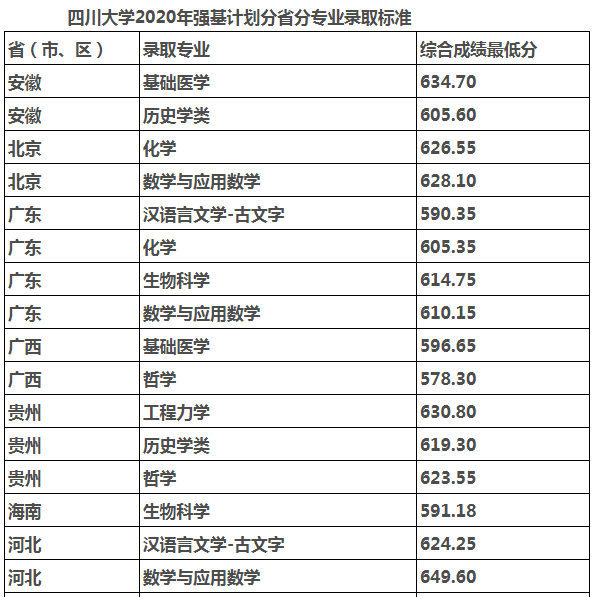 川大强基计划入围分数线在7月26日左右公布,考生须登录报名系统查询并确认结果。经查询,四川大学2020年强基计划入围分数线如下:安徽省文科626分;北京市理科664分、文科665分;福建省理科652分、文科623分;广西省理科649分、文科610分;河北省文科644分;河南省理科666分、文科639分;黑龙江省理科669分;湖北省理科655分;湖南省理科657分;吉林省理科663分、文科625分;其余江西、辽宁、宁夏、山东、陕西、山西、四川、天津、新疆、云南、浙江、重庆各省强基计划入围分数线如下图所示。