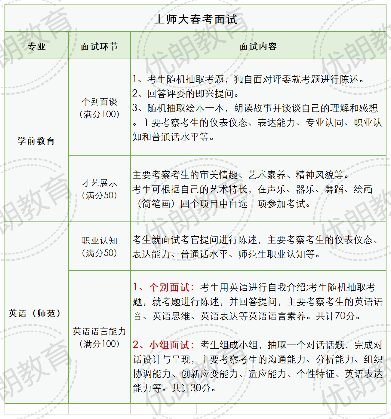 着眼于具体的面试形式,上师大春考面试会安排专业教师、区教研员、普通话测试员、幼儿园园长和行业专家等校内外专家担任面试官、评委,包括普通话、表达能力、师范生基本素质与技能、英语综合能力,英语(师范)专业和才艺展示(学前教育专业)等部分。
