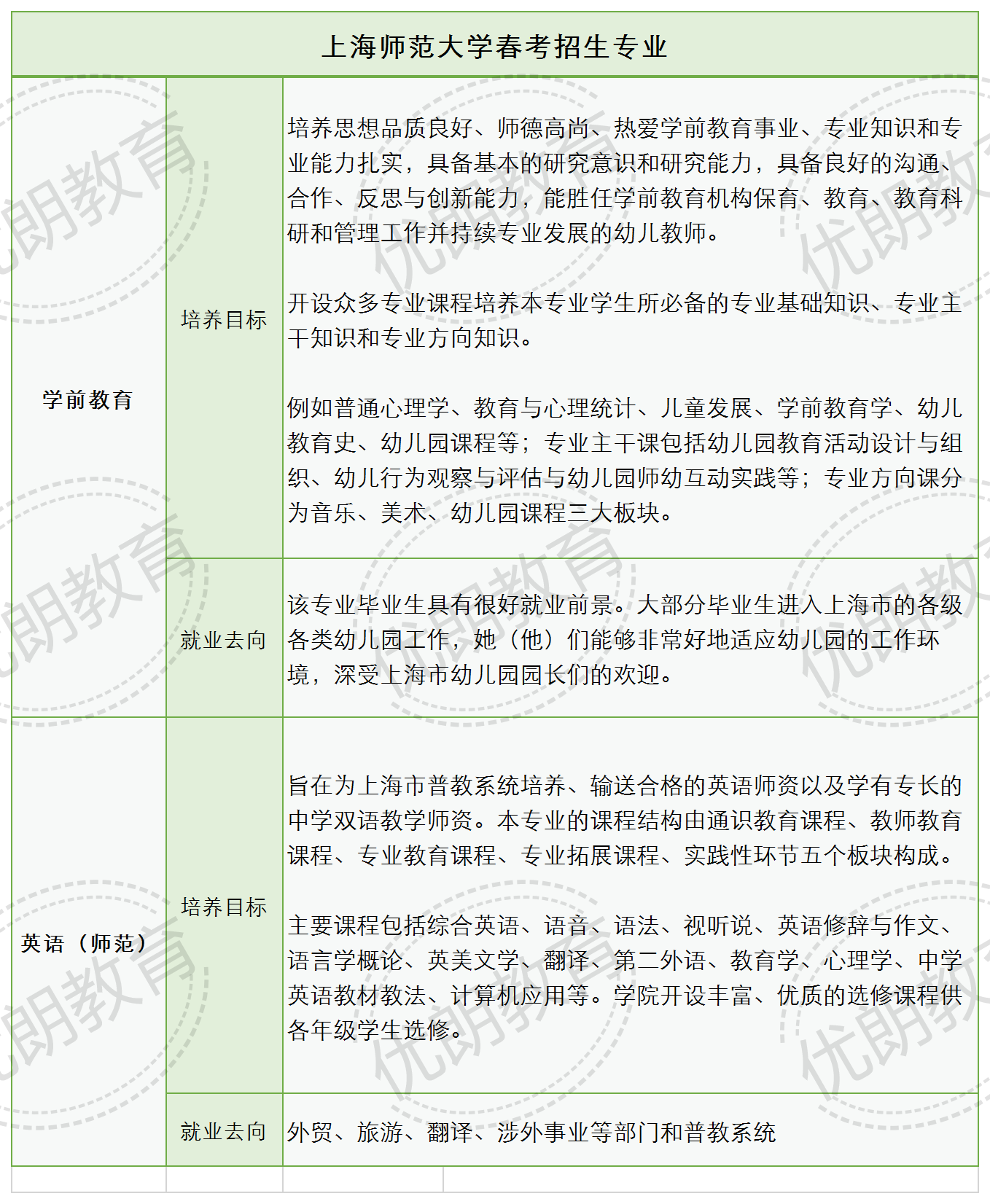 据悉,上海师范大学春考共开设两大专业,均与教育有关——英语(师范),计划招生9人;学前教育,计划招生80人。相对而言,报考学前教育被录取的概率大于英语(师范)专业。届时,上师大春考面试也会分专业进行。