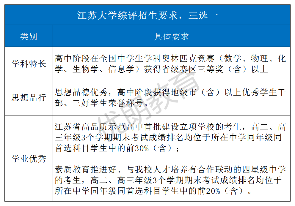 2021年,江苏大学继续施行“综合评价”招生,要注意的是,江大综评仅面向省内应届高中毕业生,且必须符合3条件之一,要么具备学科特长,要么思想品行优秀,要么有亮眼的学业成绩。