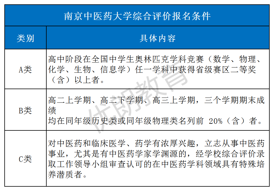 南京中医药大学,全国建校最早的高等中医药院校之一,被誉为“高等中医教育的摇篮”。为选拔具有培养潜质的优秀人才,南中医开展2021年综合评价招录计划,接受江苏省内应届高中毕业生的报考。据招生简章内容,南中医综合评价报名条件共3类,统计如下,符合其一即可网上申请。