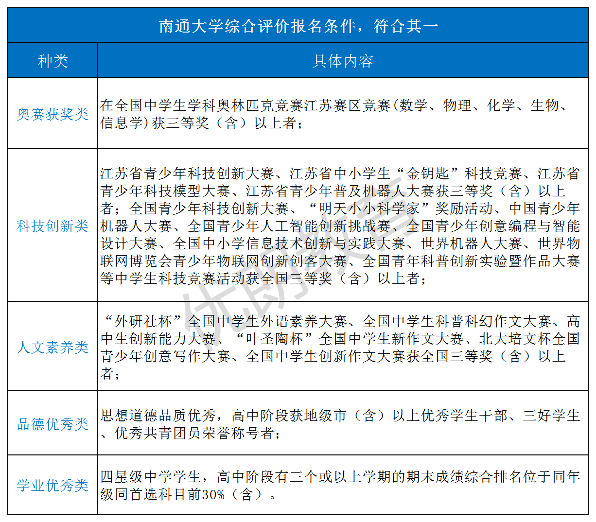 南通大学2021年实施综合评价招生,以实现“创新人才选拔机制”的目标,从招生范围来看,通大综评仅限应届高中毕业生报考,要求具有明显的专业兴趣、学科特长、创新潜质。如何证明自己符合南通大学综评招生要求?请看下图,这5类条件,满足其一,可登录阳光高考平台报名。