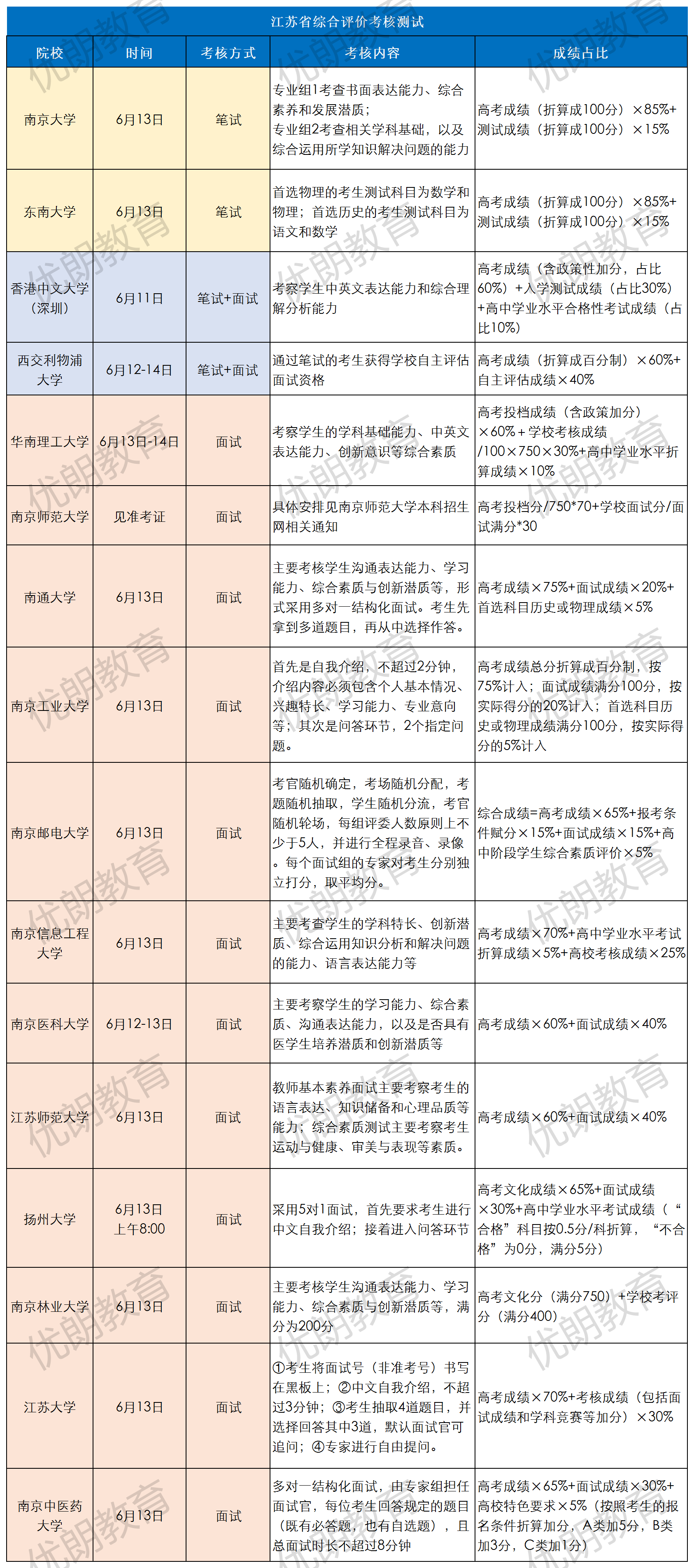 具体时间统计如图所示,仅有南大、东大只考笔试;港中深、西浦则是笔试+面试,其余院校综评考核只有面试。再看时间,最早的是港中深(6月11日开考,通过初试才有资格参加复试),大多数院校6月13日开考。有一所南京师范大学未说明面试时间,需下载准考证查看,但预估也在6月13日。注意,面试时间撞车,只能选一所学校进行考前确认。