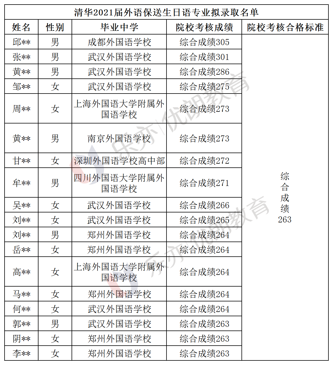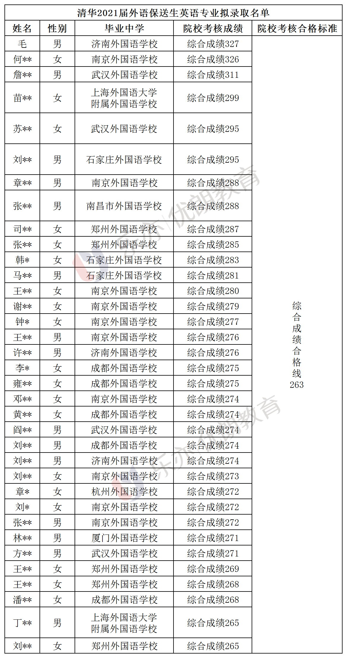 笔试/面试考核结束后,清华大学将根据考生笔试、面试的综合得分择优认定外语保送生候选人,其综合成绩构成=初评成绩(满分40分)+笔试(满分250分)+综合面试(满分60分)+口语测试(满分50分),满分400分,而外语保送生各专业录取线是263分。