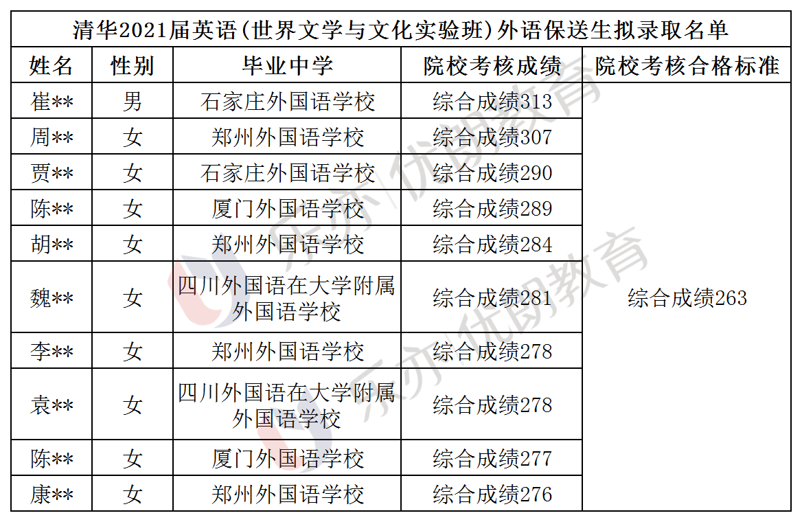 2021年清华大学英语(世界文学与文化实验班)拟录取学生10人。
