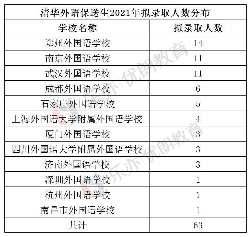 其中,南京外国语学校录取10人;郑州外国语学校录取5人;成都外国语学校录取5人;武汉外国语学校录取4人;石家庄外国语学校录取3人;济南外国语学校录取3人;上海外国语大学附属外国语学校学校录取2人;厦门外国语学校录取1人;杭州外国语学校录取1人,南昌市外国语学校录取1人。