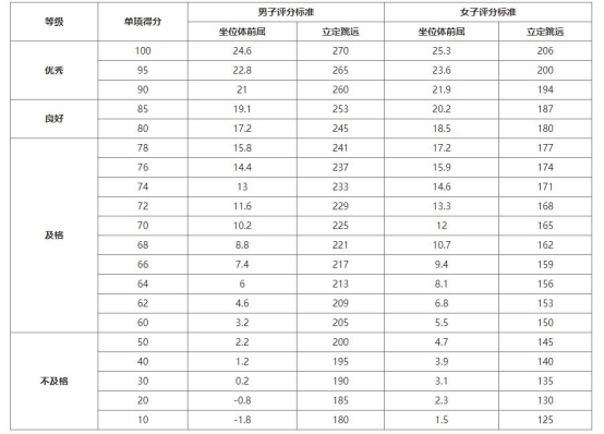 测试项目有立定跳远、坐位体前屈,均为必测项。成绩标准按照《国家体育锻炼标准施行办法》执行,详见下表: