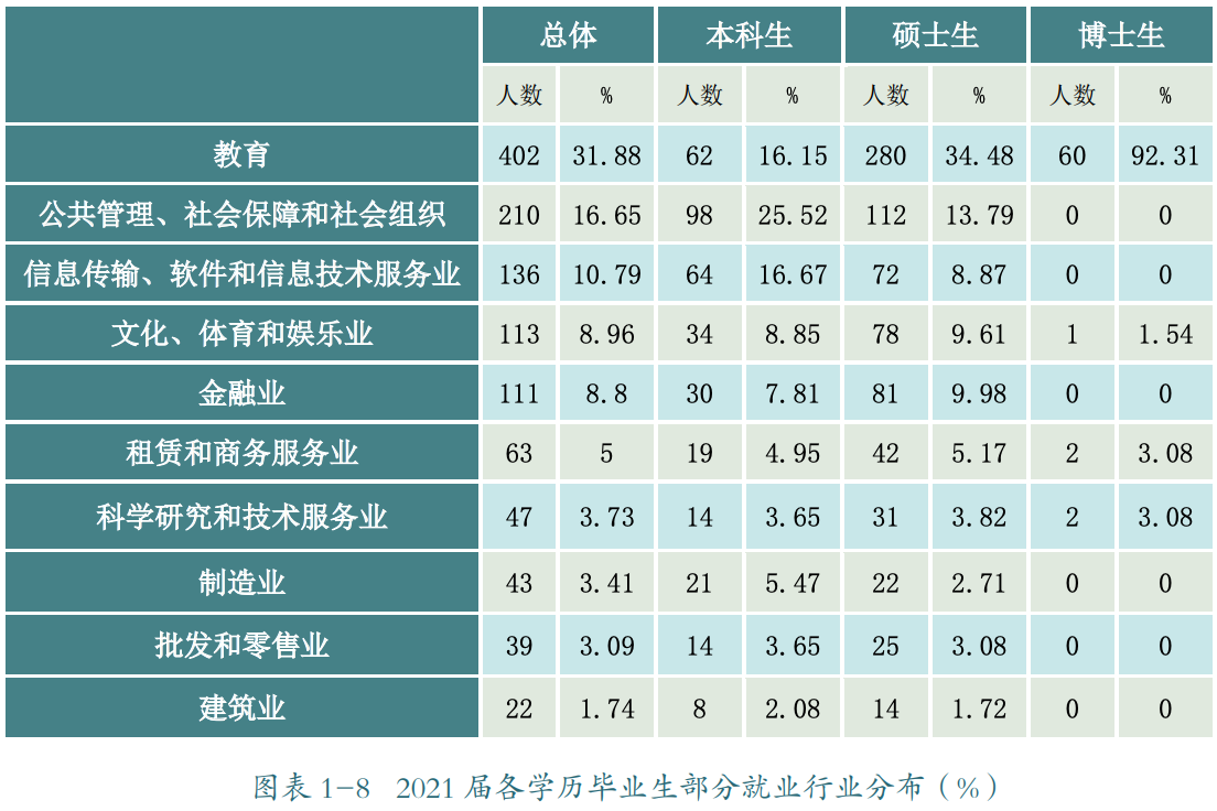 从就业单位行业分布来看,教育业,公共管理、社会保障和社会组织,信息传输、软件和信息技术服务业是 2021 届本科毕业生流向人数最多的前三个行业。