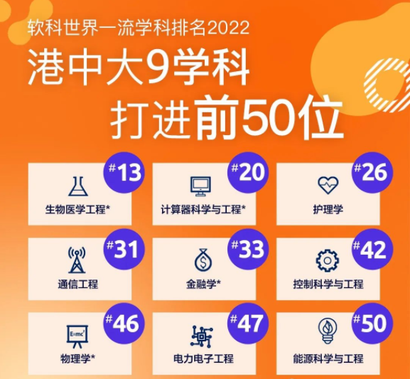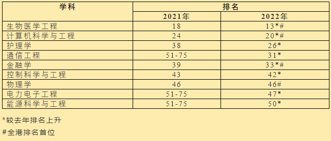见上图,港中大九个学科于2022年软科世界一流学科排名打入全球50强,较去年多三个学科夺此佳绩,包括生物医学工程、计算机科学与工程、护理学、通信工程、金融学、控制科学与工程、物理学、电力电子工程,及能源科学与工程,其中四个学科亦是全港排名首位。