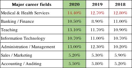 从主要职业领域上看,最受毕业生喜爱的是医疗卫生服务领域,占比14.4%;其次是教育、行政/管理两个领域,占比均为13%及以上。不过,近三年来看,比较受欢迎的就业领域每年都有一些不同,不过最受喜爱的还是同一个,具体请看下图。