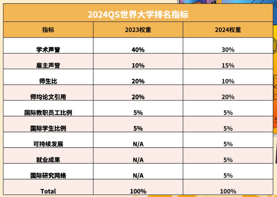 为了及时反映当下最新的趋势,今年QS对排名方法进行了有史以来最大化改善,引入了3项全新指标:可持续发展、就业成果和国际研究网络。并且,对某些已有指标的权重进行了重新校准,包括学术声誉指标、雇主声誉指标和师生比指标。