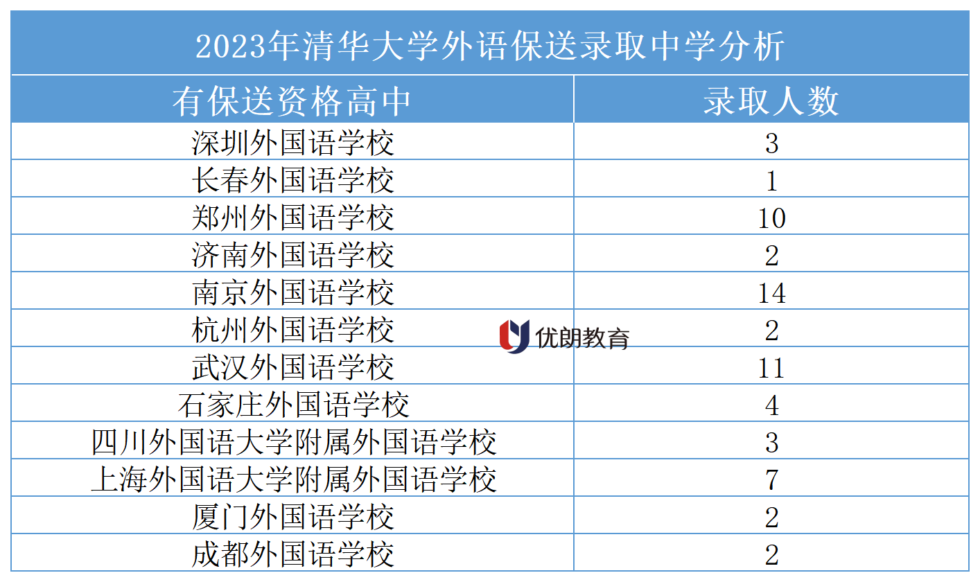 2023年,全国有资格推荐外语保送生的高中学校一共有16所,而清华大学只在12所中学有招生,天津、太原和广东外语外贸大学附中都没有招生,可见报考清华外语保送难度很大。
