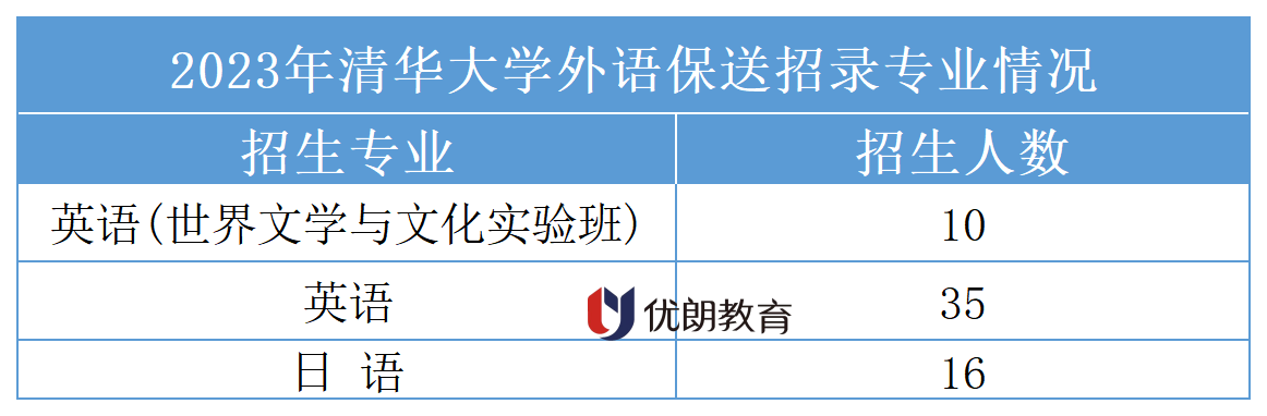 清华大学2023年外语类保送生招生专业为英语(世界文学与文化实验班),英语,日语。其中,英语(世界文学与文化实验班)只招收第一志愿考生。