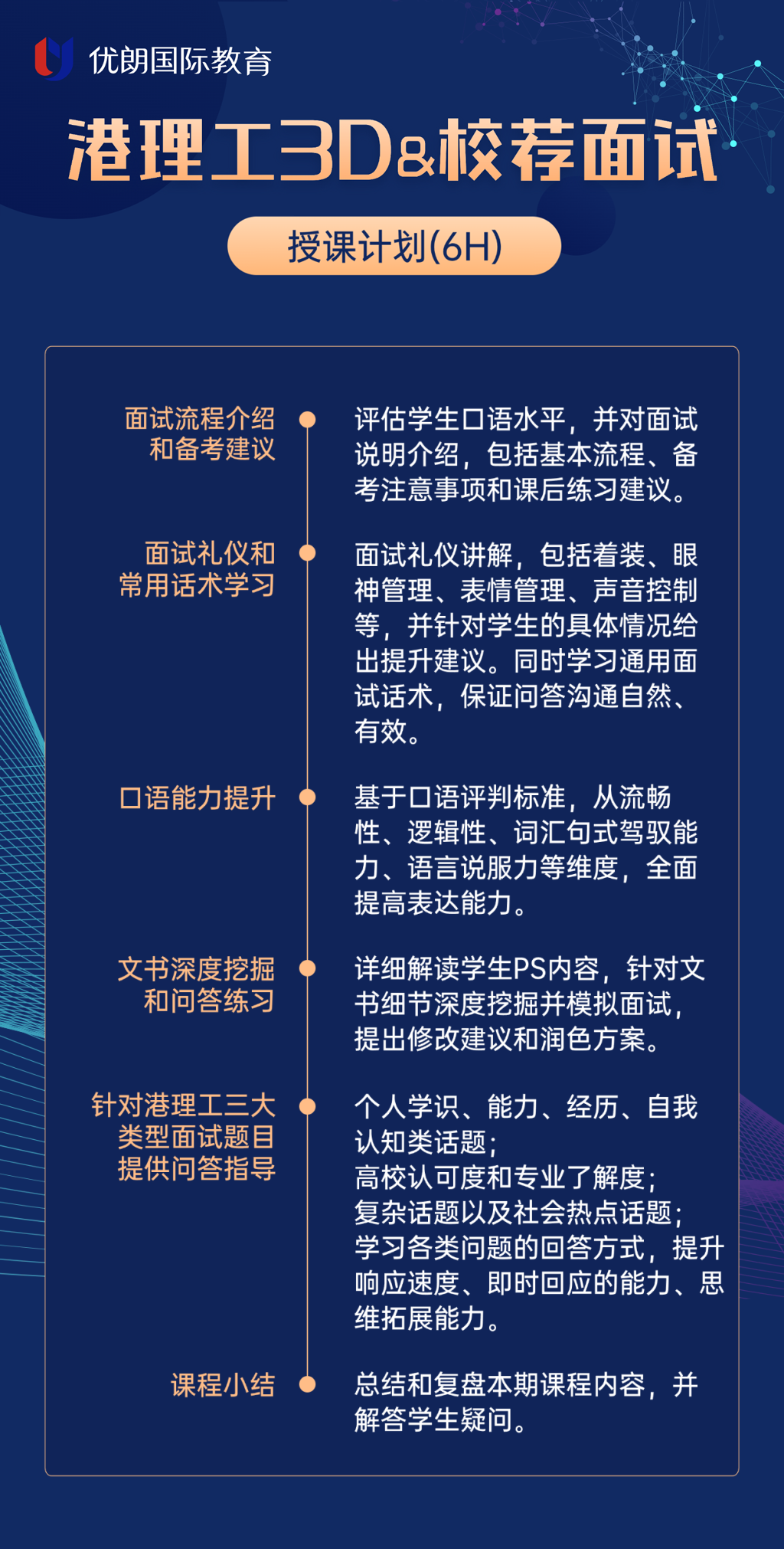 为助力考生拿到本科入学优惠,优朗全新上线2025年【港理工3D计划&校荐面试培训课程】,一对一精准辅导,名师即时点评,修正语言表达漏洞与思维逻辑短板,致力于帮助考生在面试中脱颖而出,显著提升录取竞争力,实现“语言能力+思维素养+录取优惠”三重突破!