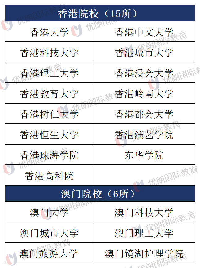 覆盖港澳21所热门高校:香港大学、香港科技大学、香港理工大学、香港树仁大学、香港浸会大学、香港岭南大学、澳门大学、澳门科技大学、澳门理工大学等。