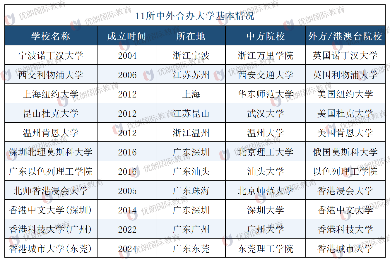 涵盖11所中外合办大学:西交利物浦大学、宁波诺丁汉大学、BNBU、上海纽约大学、昆山杜克大学、香港中文大学(深圳)、广以色列理工学院、深圳北理莫斯科大学、温州肯恩大学、香港科技大学(广州)、香港城市大学(东莞)。
