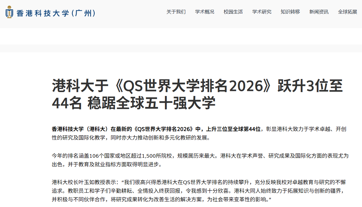 QS官网在香港科技大学页面标注“+1campus”,即广州校区,香港科技大学广州校区的官网也直接标明了26年的QS排名,体现“港科大一体双校互补”理念。港科广专业已纳入排名评估,毕业生双证含金量高。