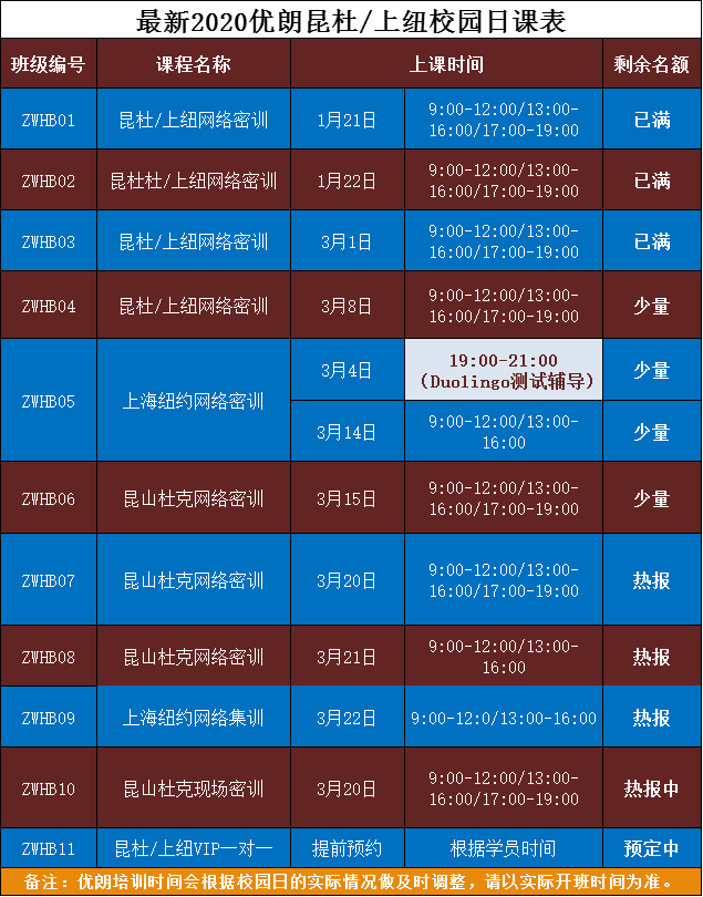 优朗英语专业从事高校面试培训已有十余年,对高校的面试内容及形式都有比较深刻和全面的理解。现昆山杜克大学2020年开始面向全国18个省招收内地本科学生,将通过面试、小组活动和模拟课堂等方式来考察考生的语言表达能力、团队协作能力及学习适应能力等综合素质。优朗针对昆山杜克大学2020年的招生考核标准,结合多年高校面试培训经验以及通过话题训练和小组模拟训练,为即将参加2020年昆山杜克大学招生面试培训的学员们推出以下课程安排。