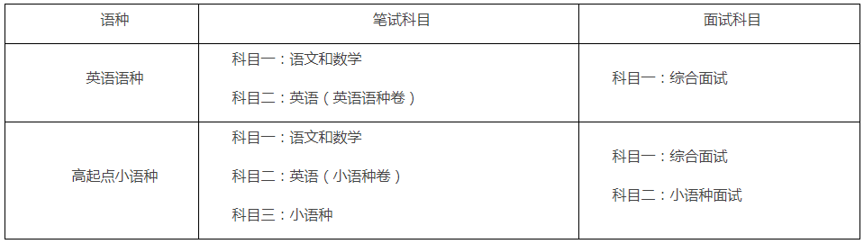 2.测试:通过审核考生须参加学校统一组织的综合测试,包括笔试和面试。笔试和面试的考试科目具体如下: