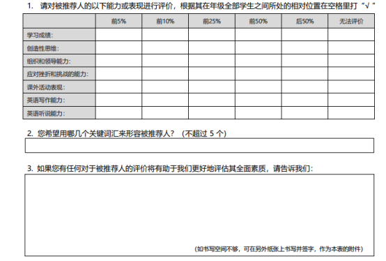 昆杜一如既往地要求一封推荐信,并提供了专用模板分中/英文两版,建议由班主任、主课老师、升学指导老师、高中学校领导等撰写。推荐信分成两大部分,第一部分为对学生的包括学习成绩、英文水平、课外活动、创造性思维、领导组织能力等维度进行打分,第二部分为推荐人的主观性评价。