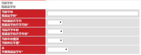 (4)目前就读学校信息,学校名称也需要用英文来填写,下面的信息可通过点击下拉框进行选择。