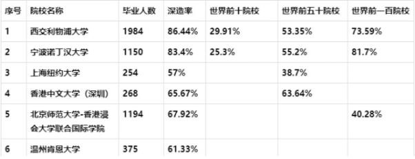中外合办大学本身就具备较高的深造率,从下表中的深造率排名来看,西交利物浦大学是位于榜首的,占比86.44%,与宁波诺丁汉大学相对持平。