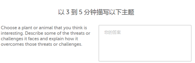 话题二选一,分问题写作。时间是5分钟,其中有30秒进行问题选择。如果不作出选择,系统默认为选择主题1。写作样本题型大都是议论性的。
