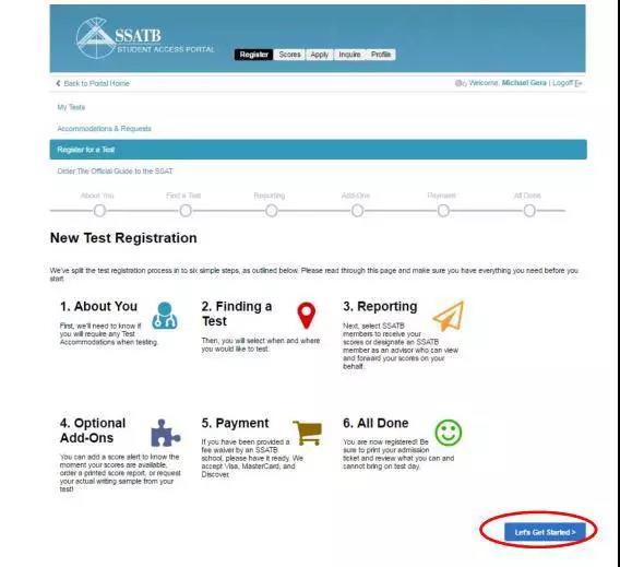 考生可点击右下角的“Let’s Get Started.”开始报名