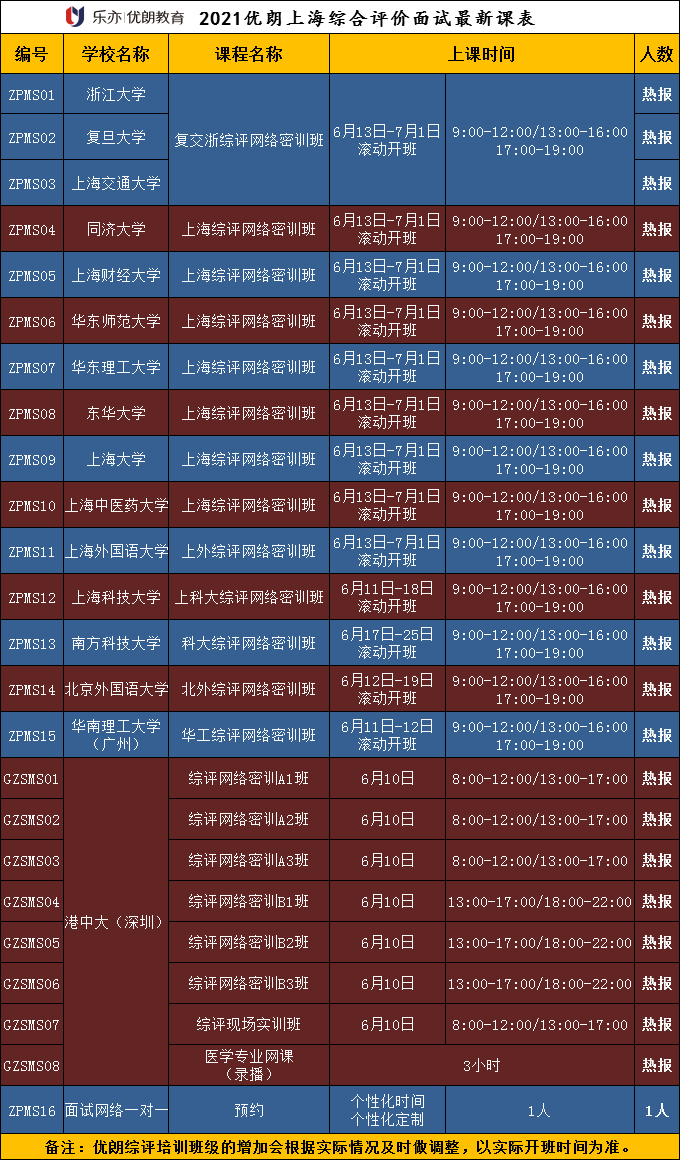 相较而言,上中医综评面试时间靠后,优朗暂定面试培训为7月中旬进行,采用线上网课形式为主,若考生有个人时间安排需求,请与优朗顾问老师沟通,可根据个人需求定制面培课,采用一对一上课形式。随后本站将更新综合评价面试培训课表,敬请关注!
